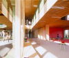 The new children’s center, which houses a school, daycare and gymnasium, has been kept as compact as possible, leaving more space for the outdoors. The design is elongated, with a narrower section in the middle, which leaves space outside for the line of sight from east to west; this allows the surrounding greenery to continue well.